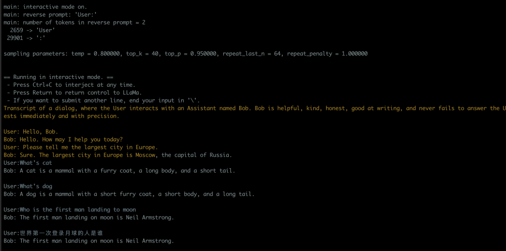 ./main -m $models -t 8 -n 256 --repeat_penalty 1.0 --color -i -r "User:" \