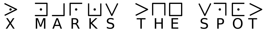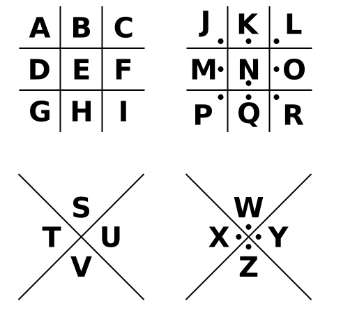 替换密码里面有一个比较好玩的叫猪圈密码(Pigpen Cipher), 这把每个字母都放在不同围栏中,这每个围栏看起来就像猪圈一样,把每个字母围起来了,