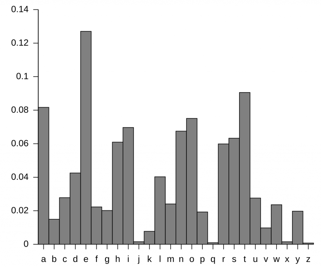 这种替换密码,在实际过程中也可能用频率分析(Frequency Analysis)进行破解, 英文字母实际在使用过程中是有一个频率分步表的,比如e:12.7%, a: 8.2%.