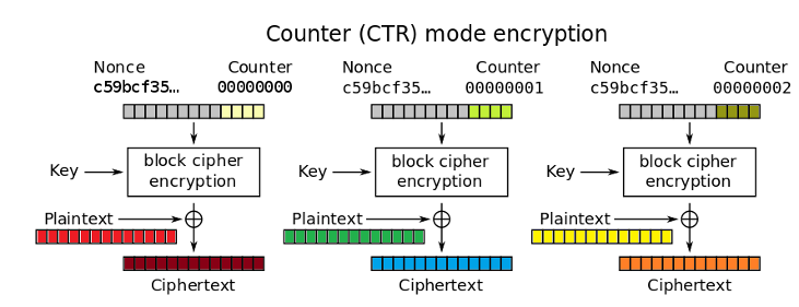 CTR计数器模式,这个模式有点像流加密(Stream Cipher), 引入一个随机数(Nonce), 然后就引入个计数器 0000, 0001, 0002, 000N