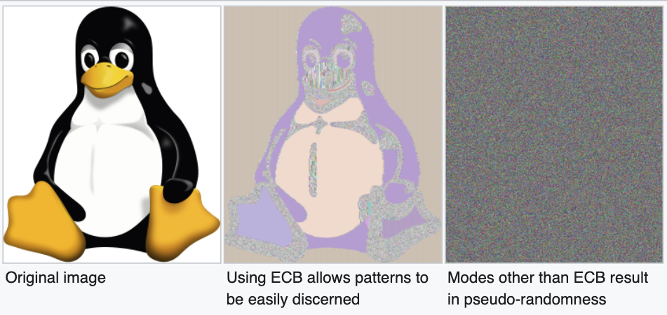 这里我们就要祭出下面这张图片了,左边是原图,中间是经常AES加密之后的结果。很明显虽然加密了,但我们还是可以看到图片的大概内容。