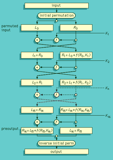 它的流程如下图,基于Feistel Network结构,16轮运算,Block Size 64位,分为左右各32位,然后进行16轮运算,每轮运算就都使用不同的密码(KDF,随称密钥派生, Key Derivation Function),最后输出同等长度的64位密文。