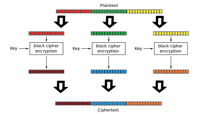 之前说过AES是Block Cipher也就是块加密,它需要把内容分成块加密,所以我们最容易想到的就是,切块之后,每个块单独进行加密,这个方式呢就是ECB模式。