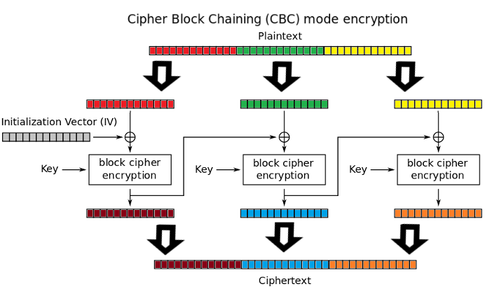 如下图就是CBC模式,引入初始向量,然后每次的密文都做为下一个加密的IV,这样就可以产生更多的随机性。