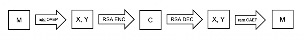 OAEP本身只是加入了一种额外的Padding, 加了一些转换操作,这样在进行RSA加密前,先把明文M变成X,Y然后再加密,解密过程正好相反,这样因为有r(随机数)的存在,每次加密出的内容都是不一样的。