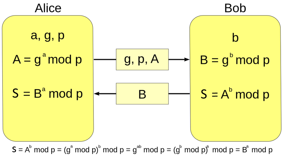 通过共享g, p, 然后再分别选取私有的a, b, 计算出A, B分别共享给对方,得到A, B之后两个人再分别计算出共享密钥S, 下面这个公式推导就证明了两个人的密钥一致。
