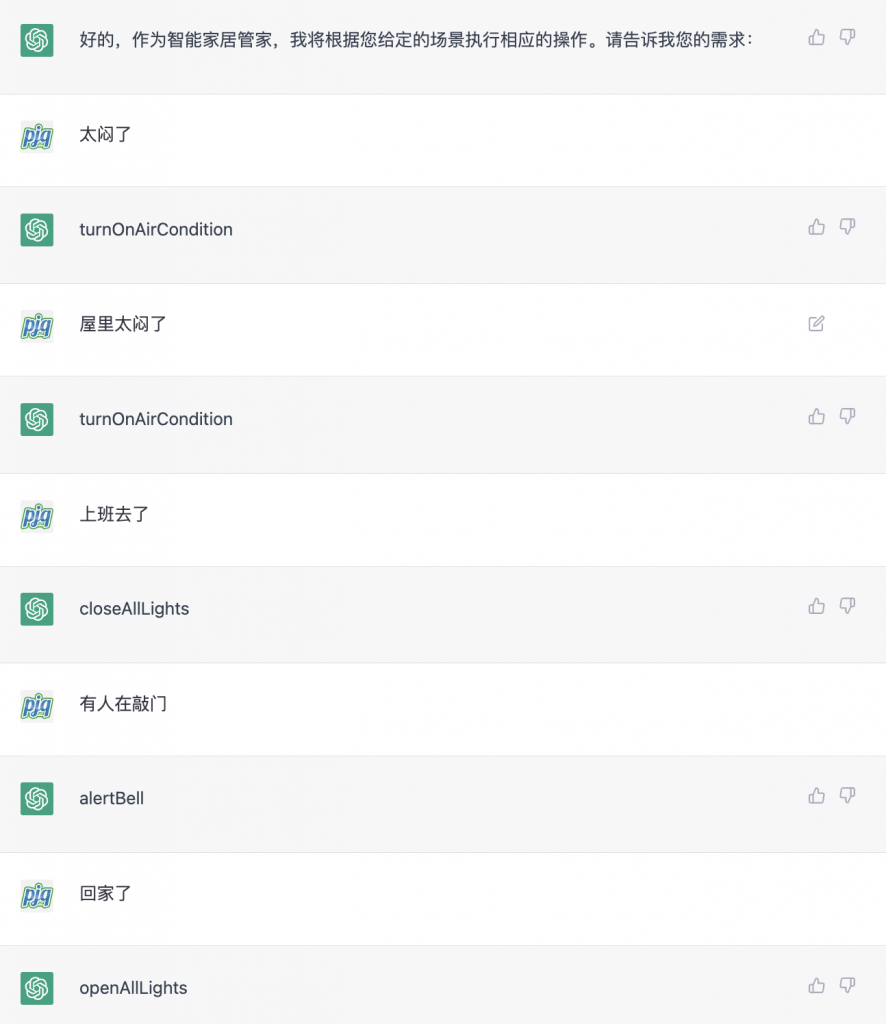 我们可以看到ChatGPT可以根据真实的场景选择合适的命令,不再需要手动一个一个去设置场景,这大概就是智能家居未来的样子。