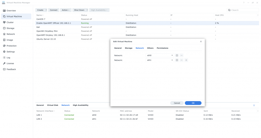 在Virtual Machine->OpenWrt这个虚拟机上加入上面新增的两个网卡,这样就等于在 OpenWrt里插入了两个网卡eth0, eth1