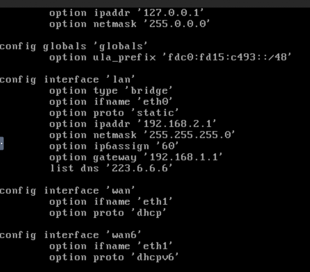 接下来在OpenWRT里面分别设置eth0(LAN2,新加的)作为局域网, eth1(LAN1,Default)作为外网连接,设置网关为家里路由器的ip, 内部局域网段为192.168.2.xxx