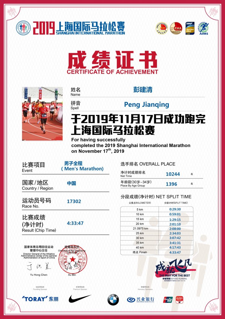 所以是不是很奇怪,最后我为什么还来能够全马跑下来?跑步的时候我定了一个策略,就是求慢,以6分钟的配速慢慢跑,如果我能够跑到20km,并且脚没有抽筋,脚踝膝盖也不疼的话,那我就可以继续往下跑。事实证明,我这个策略很正确,尽管当天温度上海马拉松史上最高,当我跑到21km的时候,身体并没有任何不适,这个时候我才决定,我可以继续跑一下。当然最后的几公里对任何人都是煎熬,地表25度以上的高温,大太阳照着,不断呼啸而过的救护车,能坚持下去的都是英雄。当跑进终点体育馆的一瞬间,你会觉得所有的一切都是值的。当然最后还是要敬畏马拉松,敬畏跑道,敬畏生命。