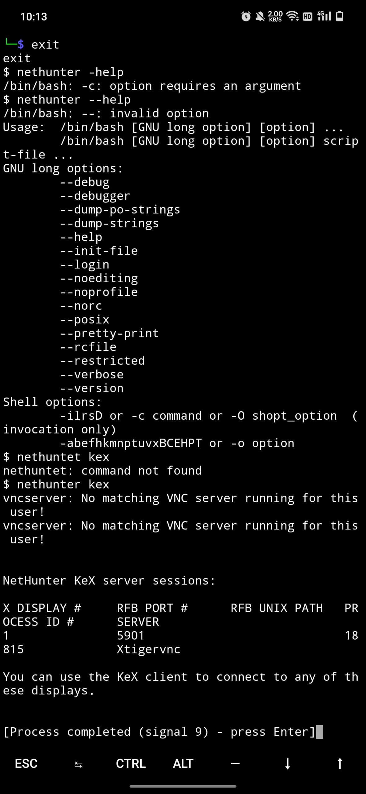 nethunterstart Kali NetHunter command line interfacenethunter kex passwdconfigure the KeX password (only needed before 1st use)nethunter kex &start Kali NetHunter Desktop Experience user sessionsnethunter kex stopstop Kali NetHunter Desktop Experiencenethunter run in NetHunter environmentnethunter -rstart Kali NetHunter cli as rootnethunter -r kex passwdconfigure the KeX password for rootnethunter -r kex &start Kali NetHunter Desktop Experience as rootnethunter -r kex stopstop Kali NetHunter Desktop Experience root sessionsnethunter -r kex killKill all KeX sessionsnethunter -r run `` in NetHunter environment as root